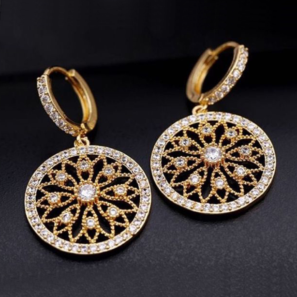 Estos Aros de Plata Italiana y Cristales presentan un diseño inspirado en la elegancia clásica, con una estructura enchapada en oro brillante y un delicado trabajo de engaste en cristales que forman una figura circular tipo mandala. Cada detalle refleja un equilibrio entre lujo y diseño artesanal, ofreciendo una pieza que destaca por su luminosidad y presencia.